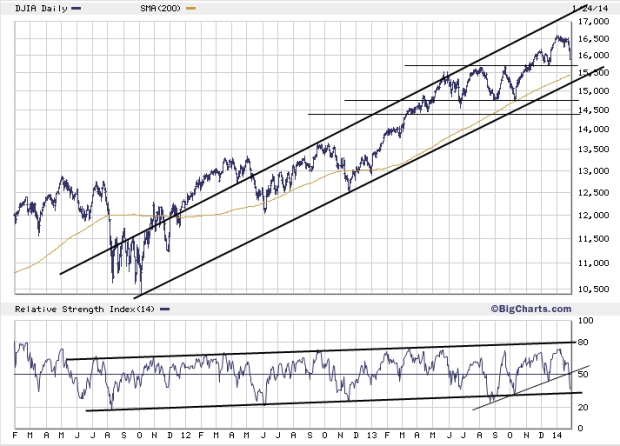 Diagrammet viser Dow Jones over en treårsperiode, med 14 dagers RSI. Det er markert lange trendlinjer for begge, og også horisontale nivåer på rundt 15 700 og 14 800 (og 14 400). Disse to nivåene (men ikke 14 400) er jeg enig i er signifikante, noe man fort ser med å sammenligne med grafen fra 1929: