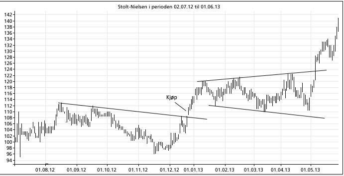 «Rektangelen» (januar – mai 2013) gir et riktig og viktig signal. Strengt tatt er formasjonen likevel ikke et rektangel, men en omvendt triangel. Hadde det vært et rektangel ville det blitt gitt kjøpssignal over 120 kroner den 10. april, slik Investtech indikerer med sitt «langsiktig trading-range»-signal. Men for triangelen kommer det ekte kjøpssignalet en måned senere, altså den 6. mai. «Trading-range» for hele perioden kunne vært riktig, uansett hvordan du trekker linjene. Men den er ikke «langsiktig», slik Investtech selv definerer sine tidsbegreper. Kanskje er de bare unøyaktige i språkbruken, og burde kalt den «mellomlang». Uansett var det første signalet deres et feilsignal, og det andre var altså strengt tatt et brudd på en omvendt triangel. Det litt snodige er at Investtech selv først tydeligvis har beregnet linjene horisontale, men siden justert dem. Dette må de ha opplevd hundrevis av ganger. Men de har ikke justert dataprogrammet sitt.