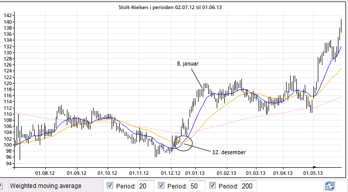 1. Det eldste signalet som er nevnt er «glidende snitt», den 8. januar 2013. Jeg vet ikke hvordan signalet trigges, men jeg vil tro det er et crossoversignal. Altså enten at et kortere snitt krysser opp gjennom et langt, eller at kursen krysser opp gjennom et tilsvarende snitt. Min egen test viser for eksempel at 50 dagers enkelt glidende snitt krysset opp gjennom 200 dager den 9. januar. Det er nesten samme signalet, i hvert fall gis det et signal omtrent på samme tid. Med WMA er datoen 3. januar. Kanskje Investtech bruker andre verdier, eller et EMA.