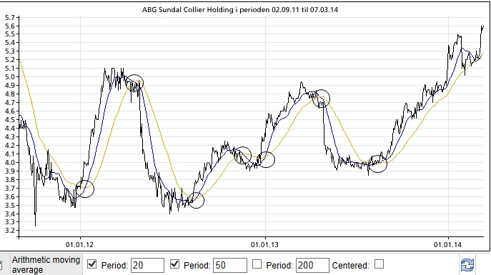 Det ene er at aksjen responderer veldig godt på kjøps- og salgssignaler ut fra 20/50 kryss i SMA. Det er noe jeg anbefaler i boka mi. Her er det markert alle de sju kryssene av denne typen siden januar 2012. Reglene her kan for eksempel være: