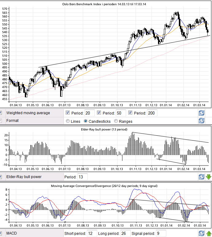 RSI har vist tydelig bearish divergens. Det samme kan ses i MACD og Elder Ray (markert i diagrammet). Alle disse tre har vist fallende topper og bunner, mens kurstopper og -bunner har vært stigende. Det indikerer trendbrudd ganske snart, til sidelengs eller muligvis ned.