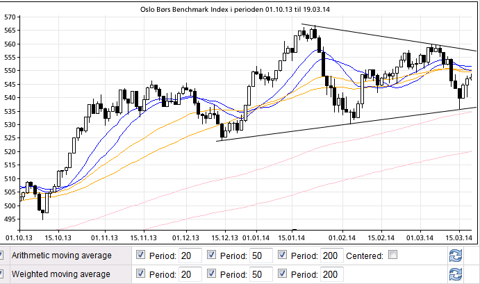 På oversiden er det først motstand i en sone av sammenfallende glidende snitt rundt 550. Her har jeg brukt både SMA og WMA på 20 og 50 dager. Tradere varierer i hvilke varianter de foretrekker. Deretter følger et trendtak. Det spennende blir sonen av glidende snitt. Vender det ned der betyr det at snittene gir signifikant motstand, som igjen øker faren for et brudd ned gjennom trendgulvet. Bryter derimot kursen gjennom betyr det at snittene ikke gir signifikant motstand, noe som igjen indikerer en mer sidelengs utvikling. Får vi etablert brudd også opp gjennom trendtaket er det positivt på lengre sikt, og indikerer mer oppgang. Selv mener jeg det mest sannsynlige nå er motstand i sonen, og ny test av trendgulvet. Men av prinsipp forsøker jeg å ikke spekulere i handler før after the fact].