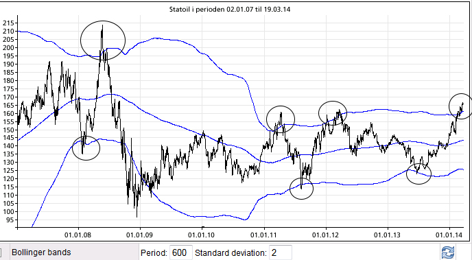 Jeg vil derfor ikke gi STL «kjøpsanbefaling på mellomlang sikt» nå, slik Investtech gjør. Stiger den rett videre herfra de neste uker og måneder vil jeg heller observere fenomenet med en åpen, aksepterende og nysgjerrig oppmerksomhet. Verden er herlig. Men bekreftelsen bør komme fra økende olje-/gasspris eller signifikante nyheter om Statoil. Hvis ikke tror jeg mest på en ganske spiss midlertidig topp (relativt sett), slik det har vært hver gang de siste seks år. Alternativet er en liten utflating, eventuelt brudd/pullback, før aksjen begynner å «bøye» det øvre båndet oppover. I så fall har vi et langt brudd (og volatilitetsbrudd) og kjøp, og en utvikling mot 200-205 kroner i 2014-2015.