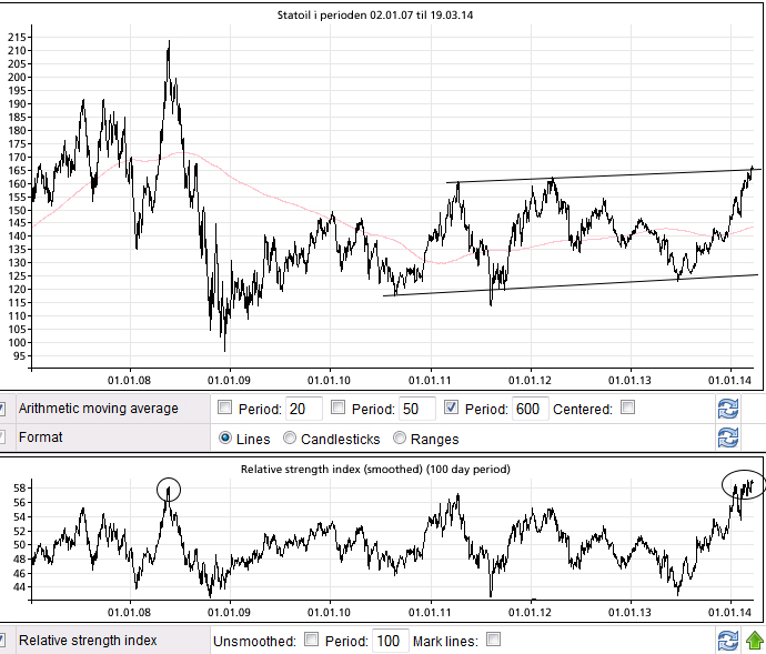 Alle lengre verdier for RSI viser at aksjen ikke har vært så overkjøpt siden boblen i 2008. Her har jeg brukt 100 dager, men det spiller egentlig liten rolle hvilken verdi jeg bruker. Merk at ennå indikeres ikke noe svakhet eller salgssignal, verken i kurs eller RSI. Men det hører med i godt analysearbeid å påpeke slike forhold. Det gjør ikke Investtech. Har du sittet siden kjøpssignalet i august 2013, og har et mellomlangt perspektiv, kan du jo vurdere å ta noe gevinst her. Signalet (eller bekreftelsen) kan du finne i utviklingen for oljeprisen, eller i signifikante nyheter for aksjen eller makromarkedet. Investtech overser forøvrig også denslags.