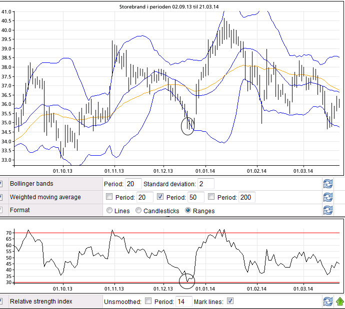 Storebrand var nede i RSI på 30 i desember. Her var det ikke støtte, men kursen bremset opp og snudde likevel. En mulig algoritme kan bygges på: