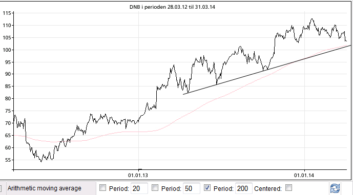 Den litt kortere trenden siden april 2013 er fremdeles intakt, med et gulv på 102 kroner. Der finner vi også 200 dagers SMA, og den lille toppen fra august 2013.