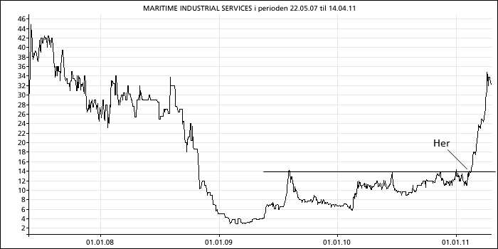 Diagrammet viser tidspunktet hvor Myrseth tok Maritime Industrial Services (MIS) inn i porteføljen sin i 2011, og hva som skjedde etterpå. Aksjen steg fra 14 til 34 kroner. Jeg tok forøvrig diagrammet ut av boken min fordi selskapet senere ble kjøpt opp og ikke lenger er på børsen. Hånden i været alle som ser likheter mellom MIS i 2011 og PDR i 2014.