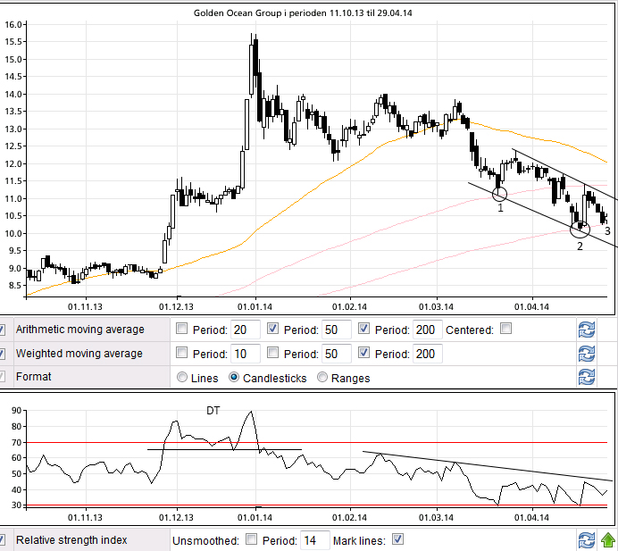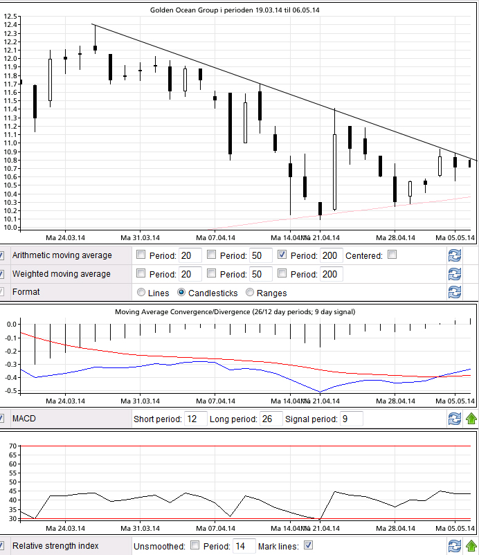 Konklusjon: Et spekulativ swingtrader (kort/mellomlang) kan forsøke en inngang her. Nedsiden burde være begrenset. Det er motstand i trendtaket (11 kroner) og siste topp (11,30 – 11,40 kroner). Brudd opp gjennom disse nivåene er kortsiktig kjøpssignal. Hel bar under 200 SMA er i utgangspunktet stop loss, men det er også et trendgulv under dette så litt is i magen kan lønne seg. Nyheter fra Kina (etterspørsel bulk) og Baltic Dry Index burde også spille inn i beslutningen.