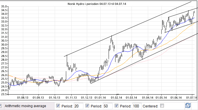 Norsk Hydro (NHY) er fremdeles blant analytikernes favoritter i 2014, både på kort og lang sikt. Aksjen ligger midt i kanalen i en pen mellomlang trend: