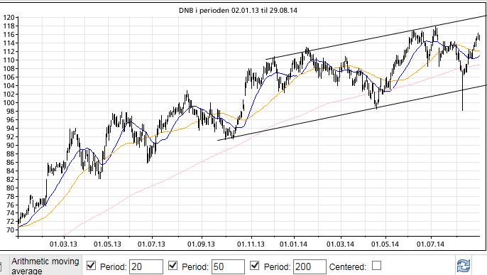 Du ser trendkanalen, som er svakt opp. Så lenge den går som den går har ikke horisontal støtte og motstand så mye betydning, ei heller snittene 20 og 50. Skulle det snu ned nå (116) eller ved 118 kan det bety en mer sidelengs utvikling.