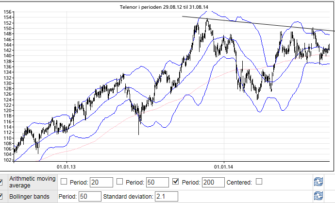 Telenor (TEL) er en interessant aksje både på kort og lang sikt. Den lange trenden (200 dager) er opp, men viser tendenser til å flate ut. Aksjen har enda ikke vært over toppene fra oktober-november 2013.