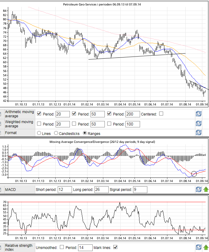 PGS ga nytt salgssignal i juli og har ikke gitt noe kjøpssignal. Aksjen er et rent verdikjøp, der 46 kroner tydeligvis er billig målt ut fra P/E og andre verdimål. Aksjen er også massivt oversolgt (RSI). Men det beste du kan håpe på her er et lite brudd opp gjennom det lille trendtaket. Det vil gi en midlertidig opptur. Deretter vil PGS få diverse glidende snitt i hodet, og sannsynligvis tendere ned igjen og i beste fall sidelengs med et snitt rundt eller under 50 kroner. Gode nyheter (og en shortskvis) kan imidlertid dra aksjen opp mot 50 SMA, og nedsiden er vel noenlunde tatt ut den nærmeste tiden, så valget av PGS som en av fem er ikke så galt som det kanskje virker. Det er også flere fondsforvaltere som har signalisert kjøp av PGS på disse nivåene. Selv hadde jeg imidlertid ikke kjøpt PGS nå.