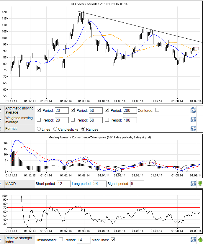 Det er et negativt overheng på mellomlang sikt, med fallende topper og et flatt støttenivå under. Teknisk sett ligger aksjen altså i en ganske flat triangelformasjon. RSI bekrefter dette, ved å svinge mellom 30 og 70. Brudd opp er klart bullish, men kanskje endrer aksjen seg da bare til et rektangel med tak på 107 eller der omkring. Vi får se.