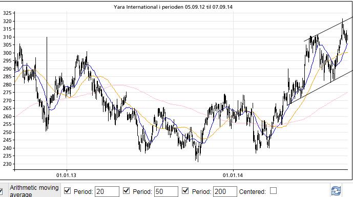 Jeg har markert den sannsynlige trendkanalen den nærmeste tiden. Det er også en annen lengre trend (2,5 år) som er svakt opp og som har et trendtak på litt over 320 (ikke markert). Ikke den beste inngangen akkurat nå, og kanskje gevinst bør vurderes om motstand på + 320 viser seg å holde. Men når det er sagt er Yara et momentum-bet som sannsynligvis vil klare seg godt den nærmeste tiden.