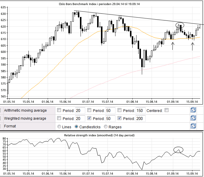 Indeksen har dratt seg over 50 MA og testet dette snittet fem ganger intradag. Støtten har holdt, som er positivt. Oppturen fra 585 var også mer ensrettet enn jeg hadde trodd. Det er også positivt. Samtidig har kjøpsinteressen over 50 MA vært lunken og avventende. Siste kortsiktige topp i RSI var bare på 61,6. Det var over det kritiske tallet 60, men bare så vidt. Det er nå motstand på 621 og i trendtaket. Deretter motstand på +- 630, som var de tre toppene fra juni og juli.