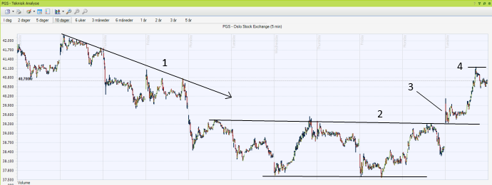 Diagrammet viser de siste ti handledager. Først et brudd ut av fallende trend for to dager siden (forleng linje 1). Deretter et brudd opp i en flat bunnformasjon i går (3). Et klokkeklart kjøpssignal, 100 % etter læreboka. Kursmålet settes til cirka 41 kroner (4).