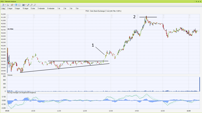 Her er intradagsdiagrammet fra i går. Etter bruddet opp gikk PGS flatt helt frem til litt før klokka 13:00. Deretter steg aksjen kraftig fra cirka 39,70 (1) til kursmålet på 41 kroner (2). Det utgjør et ekstra intradagsløft på litt over 3 %. Deretter tok de smarte traderne gevinst. I dag onsdag er aksjen forøvrig nede i 39,70 igjen (synes ikke i diagrammet).