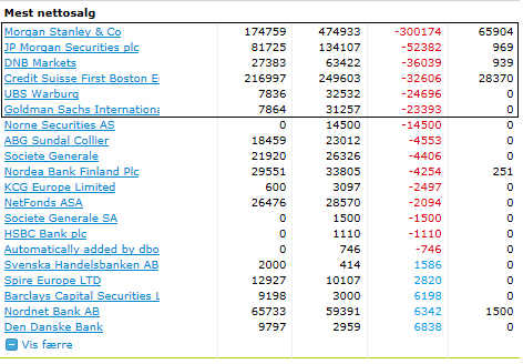 På slutten av dagen snudde dette. Som statistikken over viser hadde da amerikanerne solgt seg ut igjen og var på nettosalgtoppen. DNB Markets derimot, hadde kjøpt seg kraftig opp og var plutselig nummer to på kjøpstoppen!