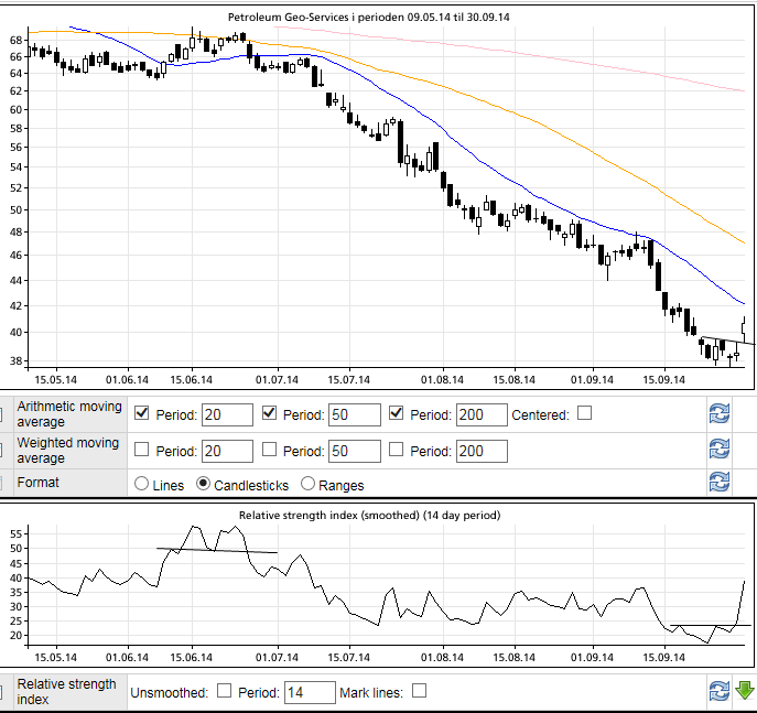 TDN Finans kommenterte stigningen slik i gårsdagens børskommentar: «Petroleum Geo-Services (PGS), steg markert tirsdag etter at UBS oppgraderte selskapet fra salgs- til nøytralanbefaling. Kursmålet ble imidlertid redusert fra 45 til 41 kroner». Som alltid en kommentar uten referanse til teknisk analyse. (Jeg har vært inne på dette en gang før).