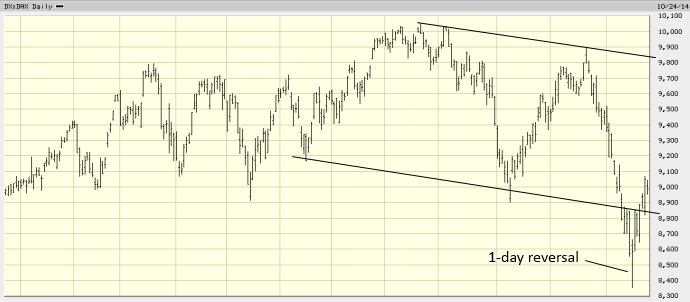 At det gikk så fort fra 530 til 575 var litt overraskende for meg, men det skyldes en solid 1-day reversal i DAX (som igjen skyldtes tilsvarende bevegelse i USA). Dette tolkes som et kjøpssignal og en swingvending fra ned til opp. 575 for OSEBX tilsvarer nå nøyaktig 9000 for DAX, som i dag endte på 8988. Men det er nå en titanisk kamp mellom de som vil opp mot 9330 og 9800, og de som vil ned fra 9000. Se gjerne forrige post for å se hvorfor 9000 er så viktig.
