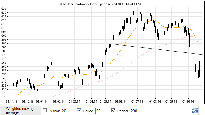 Ok, så hovedindeksen OSEBX reagerte kraftig opp fra kursmålet i den doble toppen på rundt 530. De siste tre dager har den møtt motstand på cirka 575.
