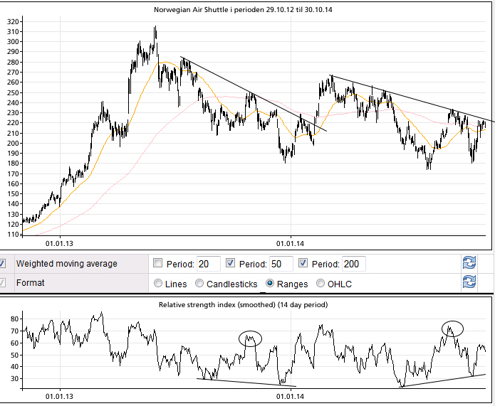 Ved forrige brudd opp kom et skikkelig løft før aksjen falt nedover igjen. Denne gangen er de tekniske forutsetningene litt bedre. Trendtaket er flatere og RSI har satt stigende bunner og topper. RSI har også markert 30 og 70 som kan indikere en trendvending, for eksempel svakt oppover i stedet for svakt nedover. Men først må vi se bruddet opp, som er kjøpssignal. Safety er salg nå eller nær trendtaket. Det finnes en mulighet for en 20/50-trampoline fra 214 kroner etterfulgt av et brudd, men den kan aldri tas på forskudd. Det kommer i så fall neste uke, men aksjen må holde seg over 214.
