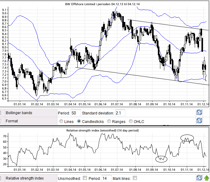 50 dagers BB med bånd på 2,1 standardavvik viser at aksjen har falt litt for mye fra 50 dagers SMA. Så lenge båndet er ganske flatt pleier det å være en brukbar inngang for en swing opp. Men noe varig trendkjøp er BWO ikke akkurat nå.