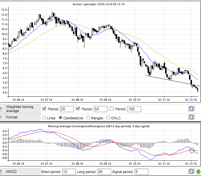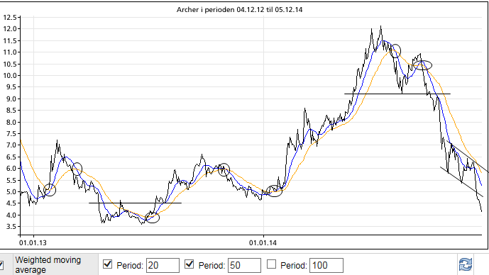 3,55 – 3,57 kroner var bunnene fra april og juni 2013. 3,35 kroner er kursmålet etter bruddet ned i den siste kanalen. Jeg har market noen kjøp- og salgssignaler ved hjelp av trendlinjer og 20/50-kryss. Ganske enkelt å benytte og ekstremt nyttig i tilfellet Archer 2013 – 2014.