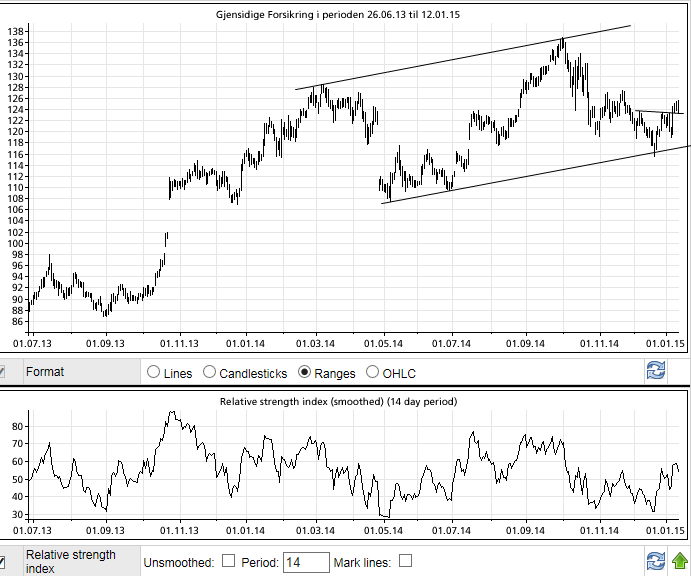 Det er etablert en svakt stigende trendkanal. Aksjen reagerte fint opp fra trendgulvet den 16. desember. Nå har den også jobbet seg over et par kortsiktige motstandsnivåer og gitt kjøpssignal på mellomlang sikt. Det er tendenser til at aksjen er i ferd med å snu den negative tendensen etter toppen i september 2014. Det er også antydning til en liten omvendt hode-skulder i desember – januar, med halslinje på 122,50 – 123 kroner. Bruddet er ikke overbevisende, men verdt et forsøk. Helst bør GJF holde seg over 122 – 123 kroner de neste dagene. Ellers er det støtte nede i trendgulvet på cirka 117 kroner.