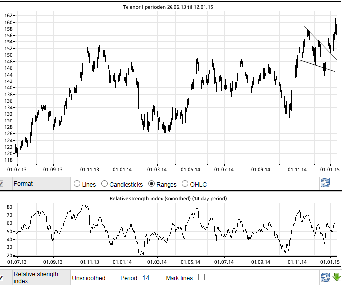 Fra en korreksjonsbunn på 130 kroner i oktober snudde aksjen på hælen og presterte en uavbrutt overrekyl til 154 og så 158 kroner på tre -fire uker eller så. RSI(14) gikk fra 24 til 77 i en nesten rett strek. Slikt skal egentlig ikke skje. Med Telenor har det aldri skjedd før, så vidt jeg kan se. En ny korreksjon måtte da komme, og tok form av en kile (wedge). Det er antagelig den mest bullish av alle fortsettelsesformasjoner (Bulkowskis Encyclopedia). Etter nytt brudd opp er videre oppgang indikert.