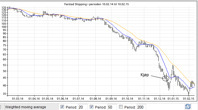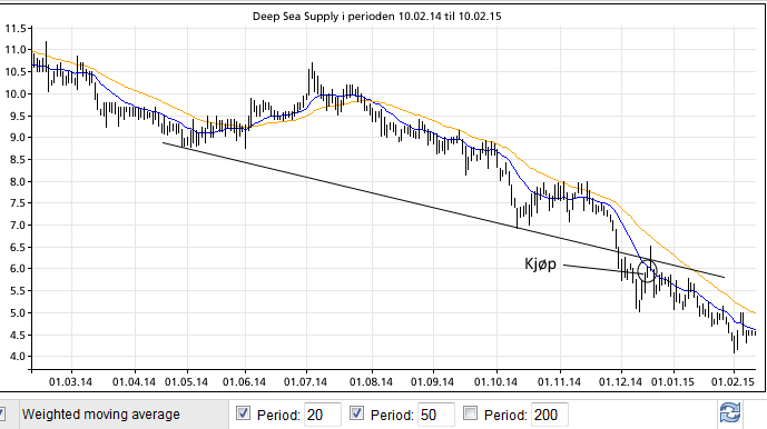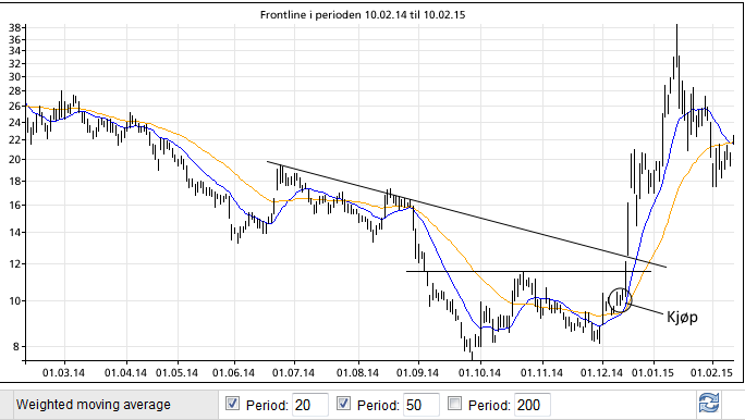 En god spekulativ anbefaling av Frontline (DNB). Mulig 20/50-trampoline, mulig dobbel bunn. Noen dager senere kom det to viktige brudd, både dobbel bunn og brudd på fallende trendlinje. DNB var her heldige med timingen, ettersom ingen kan forutse slike brudd. Men aksjen viste positive tendenser og var et mulig godt kjøp. Kjøper du ti slike aksjer, vil kanskje åtte av dem ha en dårlig utvikling, mens én av dem går til himmels og redder totalavkastningen.
