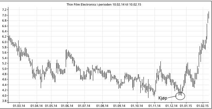 En spekulativ og god anbefaling av Thin Film (Stig). Type: Aksje i definert trading-range, etter sell-off, kjøp nær støtte. Kursmål var 5,20 (30 %). Bruddet opp derfra i januar var nytt kjøpssignal og ikke forutsigbart.