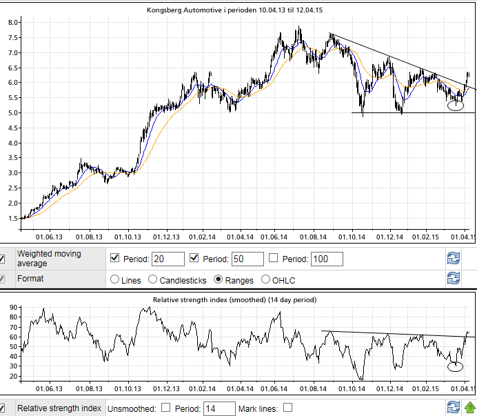 En aksje som har indikert trendvending fra svak ned til flat eller opp er Kongsberg Automotive (KOA):