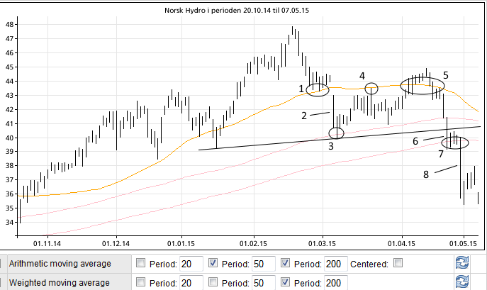 I stedet kom en swing opp til 50 SMA (4), som denne gangen ga motstand. Det er ikke bra. Ved neste test (5) gled kursen lett opp og ned gjennom snittet, som indikerer flat utvikling og at den mellomlange trenden er slutt.